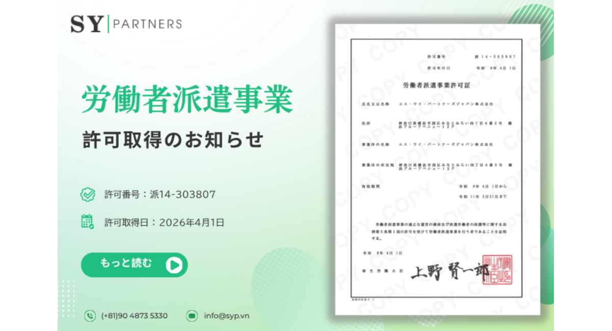 この度、エス・ワイ・パートナーズジャパン株式会社(代表取締役 ヴ・ティ・ビック・ゴック)は、労働者派遣事業に関する許可を取得いたしましたので、下記の通りお知らせ申し上げます。
