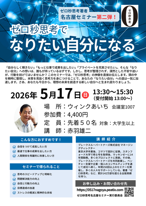 赤羽雄二名古屋セミナー運営委員会(所在地:岐阜県多治見市、代表:金井夢子)は、「0秒思考」著者・赤羽雄二氏による一般向けセミナーを、2026年5月17日(日)にウインクあいちにて開催します。