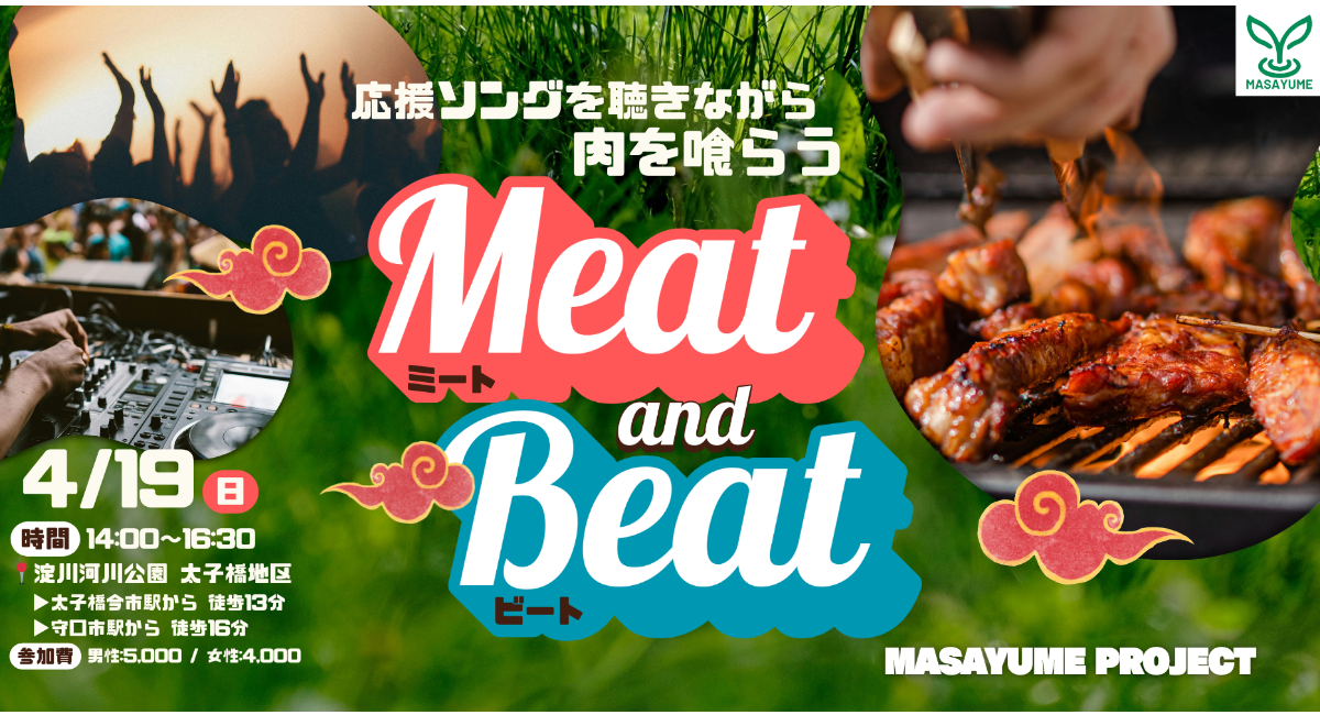 MASAYUME(マサユメ)【代表:北川正博】は、2026年4月19日(日)14:00-17:00、淀川河川公園にて、BBQ企画『Meat & Beat』を開催いたします。応援ソングを聞きながらBBQを楽しめるイベントです。(参加申込: