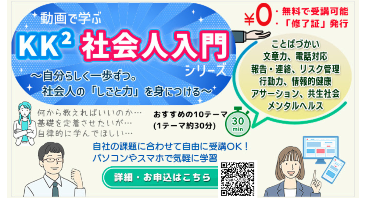 このほど、新人研修において「限られた時間で基礎をしっかり定着させたい」「テレワークや多忙な現場でも自律的に学んでほしい」「何から教えればいいのか迷っている」とお悩みの人事や現場の教育担当者を対象に、2,000本以上のKK²動画ライブラリから10のテーマを厳選したオンライン学習プログラム【動画で学ぶ「KK²社会人入門シリーズ」】の提供を開始いたしました。