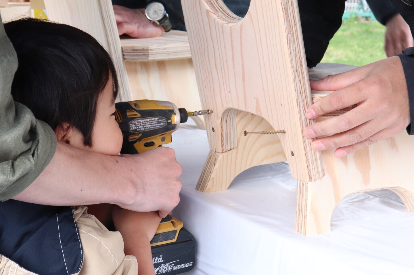 木工教室では、「イスづくり」と「踏み台づくり」の2種類をご用意。大工スタッフがサポートしますので、お子様や初めての方も安心して挑戦できます。各日限定25個・1家族1個となっていますので、お早めにどうぞ。