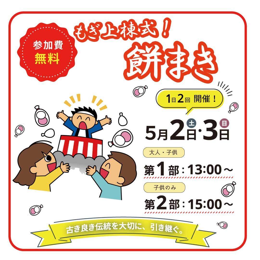 当日は各日2回に分けて開催。13時からの第1部はお子様から大人まで全員ご参加いただけます。15時からの第2部は、お子様専用です。空を舞うお餅とともに、皆様にたくさんの「福」が届きますように。