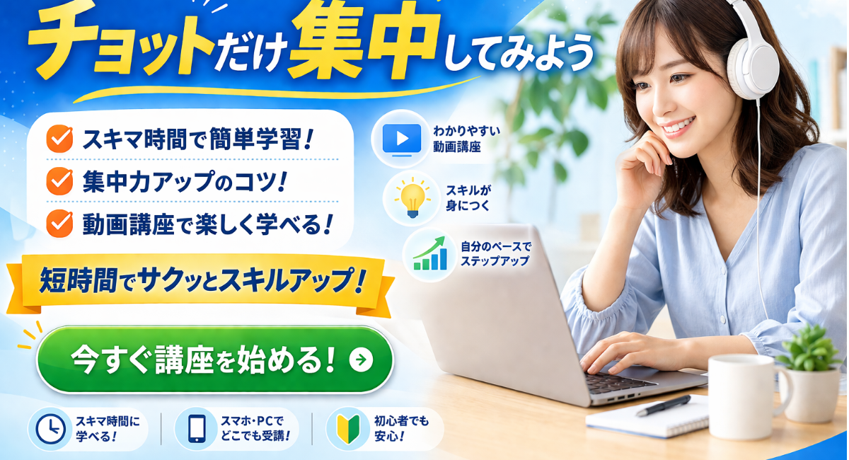 本サービスは、時間や場所に縛られず、自分のペースで学べるオンライン学習サイトです。スマートフォンやパソコンからいつでもアクセスでき、通勤時間や家事の合間など、日常のスキマ時間を有効活用して効率的にスキルアップが可能です。