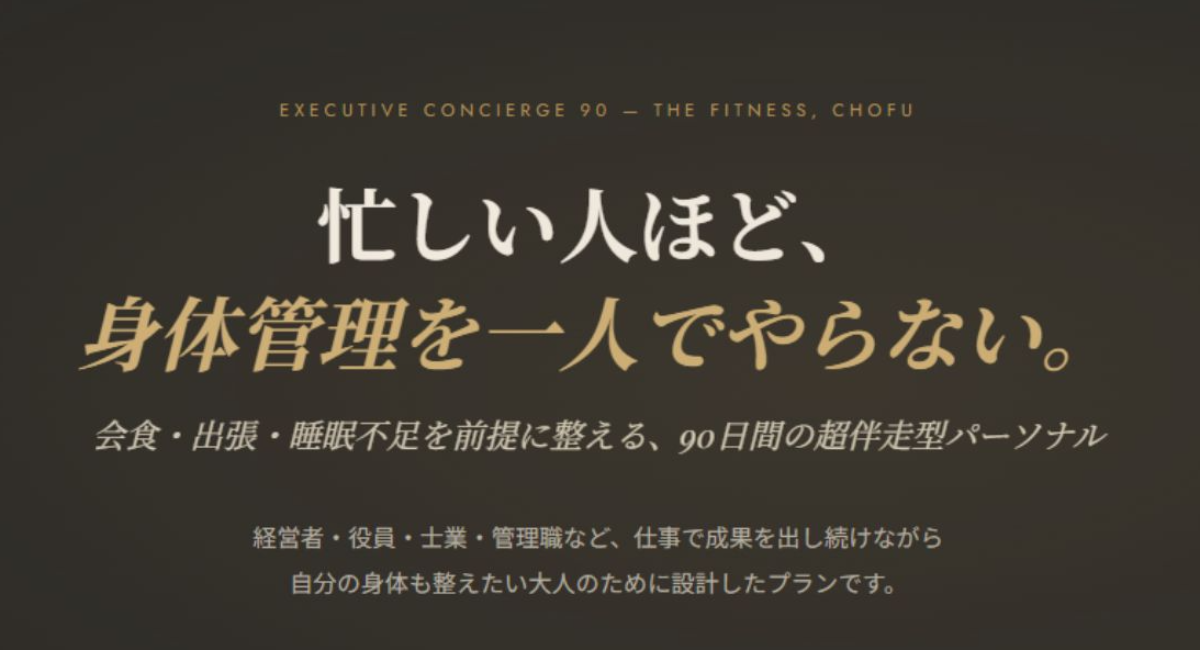 調布市のパーソナルジム「THE FITNESS」、経営者・管理職向け超伴走型ボディマネジメントプラン「Executive Concierge 90」を提供開始——会食・出張・睡眠不足を前提に、90日間で身体と生活を整える