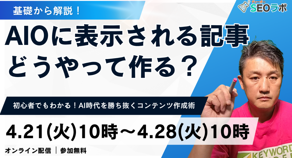 SEO対策サービスの開発・販売を行っている株式会社ディーボは、2026年4月21日(火)10時から2026年4月28日(火)午前10時まで視聴可能な配信型のSEO対策セミナーを開催いたします。テーマは、「AIOに表示される記事、どうやって作る?」です。▼セミナー詳細