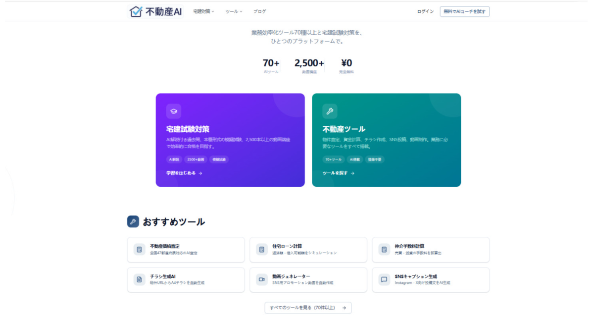 https://www.takkenai.jp/)は、不動産のプロフェッショナルを対象に開発されたAI搭載の業務効率化プラットフォームです。2024年にサービスを開始し、個人運営ながら急速に機能を拡張。現在では全84種のツールをすべて完全無料で提供しており、宅建士試験対策から実務サポートまで幅広くカバーします。