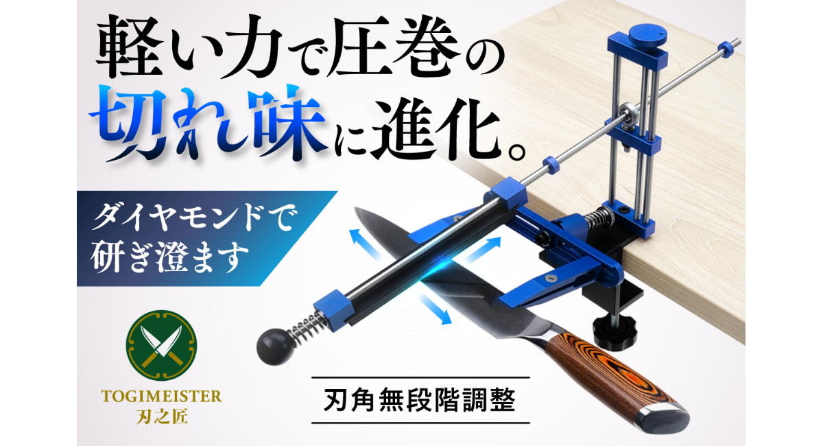 「刃之匠」は、刃物を固定台にセットし、ダイヤモンド砥石をスライドさせるだけで、素人でもプロ並みの切れ味を実現できる次世代型シャープナーです。