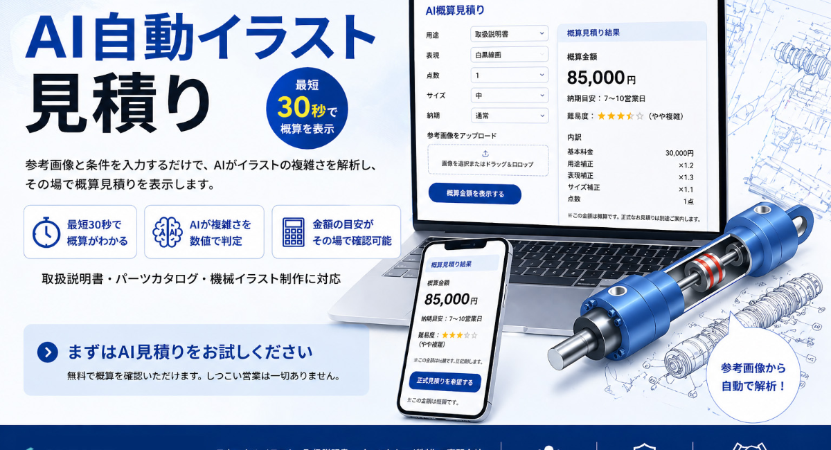 株式会社クリエイトサポート(所在地:岐阜県多治見市、代表取締役:日置 勝己)は、参考画像からテクニカルイラストの概算制作費を自動算出できる「AI自動イラスト見積り」機能を、2026年4月27日より公開しました。